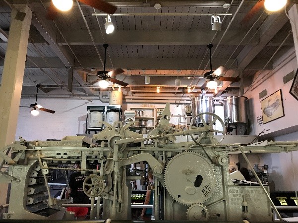 Located next to the bottling machines is the well that provided water in the early years of Dr Pepper bottling. An underground aquifer of artesian water was the source. The water from the well was pumped to the third floor to be filtered and distilled, then it came back down to the first floor through hoses. In the 1920s the well was filled with broken bottles and forgotten until the restoration of the building in the 1980s. They excavated to the depth of 27 and a half feet, which is what you can see today!