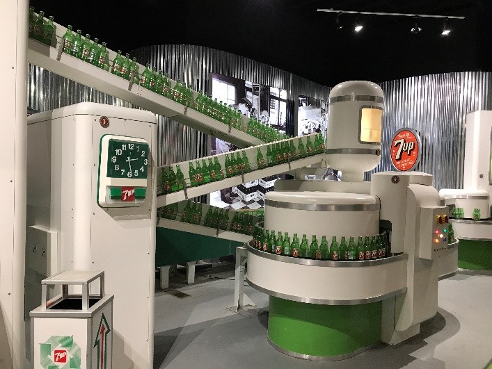 This mock line demonstrates 7UP bottling between 1975 and 1985 by the Holt and Getterman families. Watch the bottles as they travel down the conveyor belts and fill with 7UP.   This gallery was named in honor of the Holt-Getterman family who are a great example of the success and growth of the soda industry through its unique franchise system. In 1936, E.E. Holt, president of the Holt Beverage Company, signed an exclusive contract with 7up for distribution in the nine counties surrounding Waco. Soon after, the company changed its name to the 7up Bottling Company of Waco.